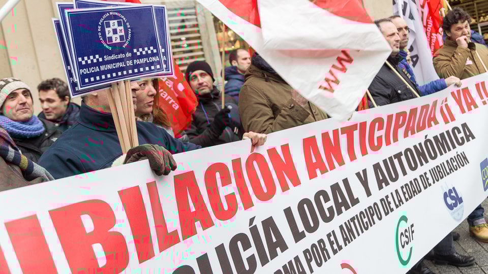 Policías locales y forales han participado este viernes en una concentración en Pamplona, convocada por los sindicatos CCOO, UGT, CSIF, CSL y COP, para exigir al Gobierno central que materialice la anticipación de la edad de jubilación a los 60 años para este colectivo.