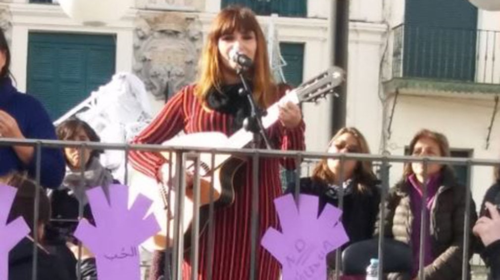 La artista manchega, acompañada de su intérprete en lengua de signos, Beatriz Romero, ha cantado en directo La puerta violeta como colofón al acto celebrado en la capital ribera para conmemorar el 25-N, el Día Internacional para la Erradicación de la Violencia hacia las Mujeres.