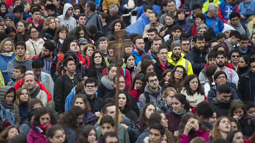 Peregrinos asisten a la eucaristía junto al castillo de Javier, en una imagen de archivo. PABLO LASAOSA