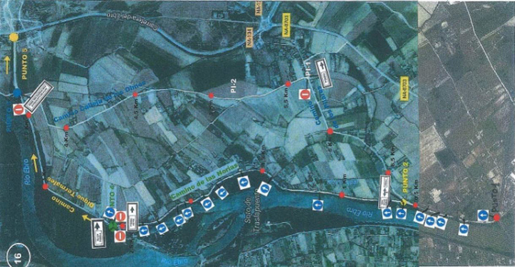 En cuanto a la ordenación del tráfico, tal y como puede verse en el plano adjunto enviado por la Policía Local, habrá un sentido único de circulación, desde el puente del Ebro hacia el Soto de las Norias. De este modo se podrá salir en dirección Tudela por la NA-8703 y la NA-134.