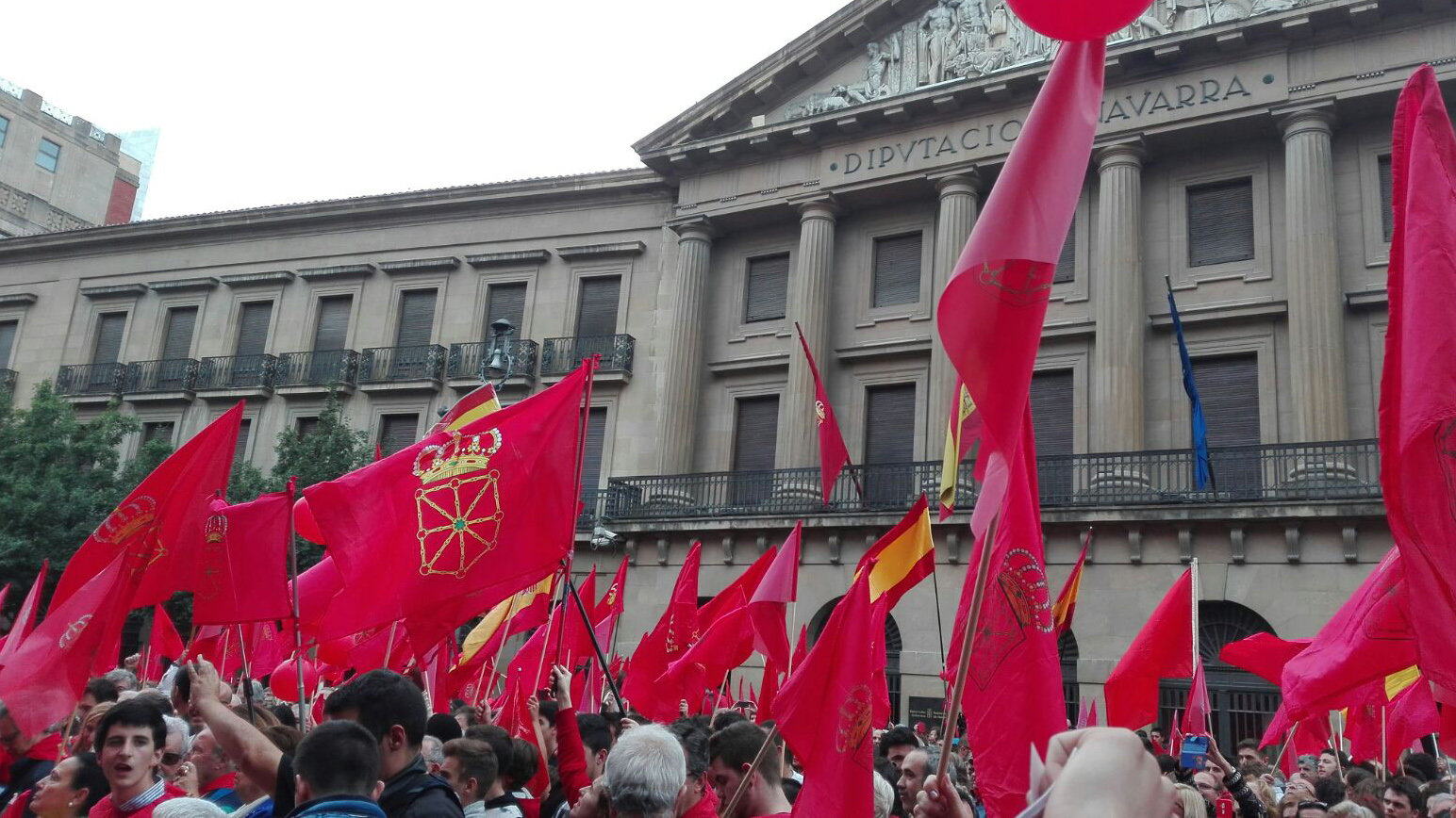 Miles de personas han teñido de rojo las calles del centro de Pamplona, congregadas en la calle Navas de Tolosa frente al Parlamento foral como simbólica protesta ante el viraje nacionalista al que el Gobierno presidido por Uxue Barkos está llevando a Navarra.