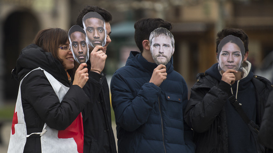 Cruz Roja Navarra ha salido este viernes a la calle con la campaña #NavarraRefugia cuyo eje central ha sido el reparto de "caretas" de fotos de personas refugiadas, que muestran en su reverso testimonios reales del motivo por el que huyeron de sus países.