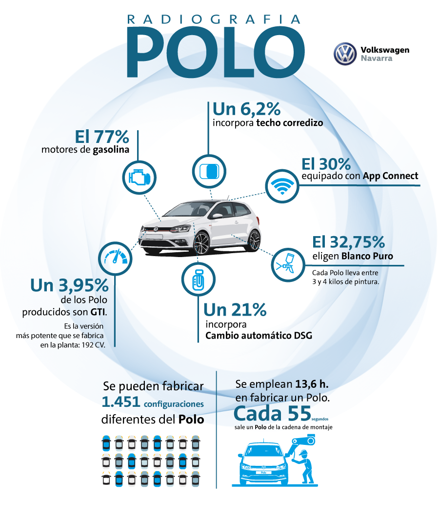 Volkswagen Navarra es la fábrica de referencia en la producción del Polo, un modelo que llegó al mercado en el año 1975 y que se produce en España desde 1984. Desde entonces, a 31 de mayo de 2017 en la factoría de Pamplona se han fabricado 7.559.320 unidades, cerca de 297.000 durante el año pasado. Cada 55 segundos sale un Polo de la cadena de montaje de la planta navarra.
