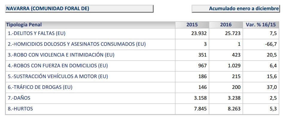 En cuanto a Navarra, la criminalidad aumentó un 7,5 % en relación al anterior año, convirtiéndose en la mayor subida de toda España a pesar de ser uno de los lugares en los que menos faltas y delitos. Respecto a los delitos cometidos, todas las categorías experimentan un crecimiento, a excepción del homicidio o el asesinato, que pasó de 3 en 2015 a 1 en el pasado año.