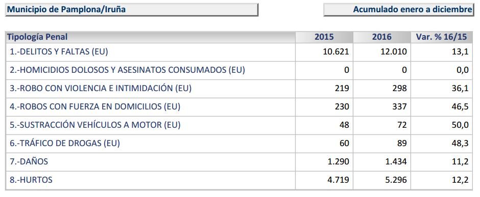 Los datos de la capital no son mucho más halagüeños. Pamplona ve aumentada su criminalidad en un 13, 1 %, lo que supone un aumento de casi 2.000 delitos y faltas en 2016.