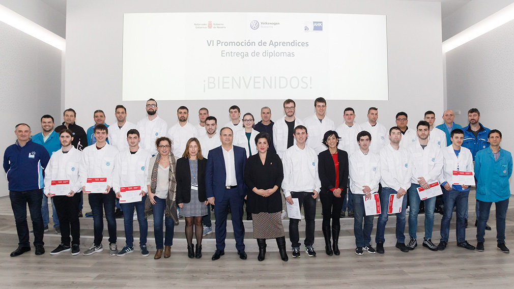 De izquierda a derecha, en la fila inferior, Pedro Valencia Valencia (Volkswagen Academy), Rubén Arana Iriarte, Aritz Larraya Artieda, Alejandro Mañas Rubio, Esther Monterrubio Ariznabarreta (directora del Servicio de FP del Gobierno de Navarra), Raquel López Martín (responsable de Proyectos del área de Formación de la Cámara de Comercio Alemana en España), Mikel Herrera Isasi (gerente de Estrategia y Desarrollo de Recursos Humanos de Volkswagen Navarra), María Solana Arana (portavoz y consejera de Educación del Gobierno de Navarra), Aitor Ciriza Mayo, Eugenia Larrea Calvo (responsable de Volkswagen Academy), Diego García Marín, Gorka Ripa Plaza, Ibon Serrano Urbiola, Aritz Osácar Jiménez y Santiago Albéniz Martiarena (Volkswagen Academy). Detrás, de izquierda a derecha, Gonzalo Medrano Medina (Volkswagen Academy), Miguel Ángel Cervantes Aranaz (Volkswagen Academy), Eduardo Aguerri Asiain (Volkswagen Academy), Goizeder Ugarte Molinet, Miguel López de Dicastillo Gastón, Íñigo Arteaga Artola, Asier Zubicoa Pozas, Iker Oroz Jiménez, Mikel Sagaseta Urrutia, Leire Muniain Monescillo, Alfredo Morales Vidarte (presidente del Comité de Empresa de Volkswagen Navarra), Sergio Sanz Zudaire, Ion Apat Mina, Josu Oteiza Iribarren, Alejandro Royo Rodríguez, Mario Yaulema Morocho, Daniel Murguialday Ancín, Jokin de Carlos Mina (Volkswagen Academy) y Daniel Herrero Escuin (responsable de la Comisión de Formación del Comité de Empresa de Volkswagen Navarra). VOLKSWAGEN
