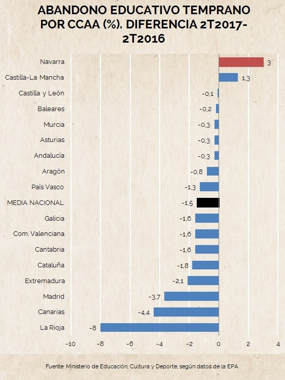 Este hecho se traduce en que en 2015 Navarra era la tercera comunidad autónoma con menor tasa de abandono escolar, mientras que en el segundo trimestre de 2017 se encuentra en el quinto puesto.