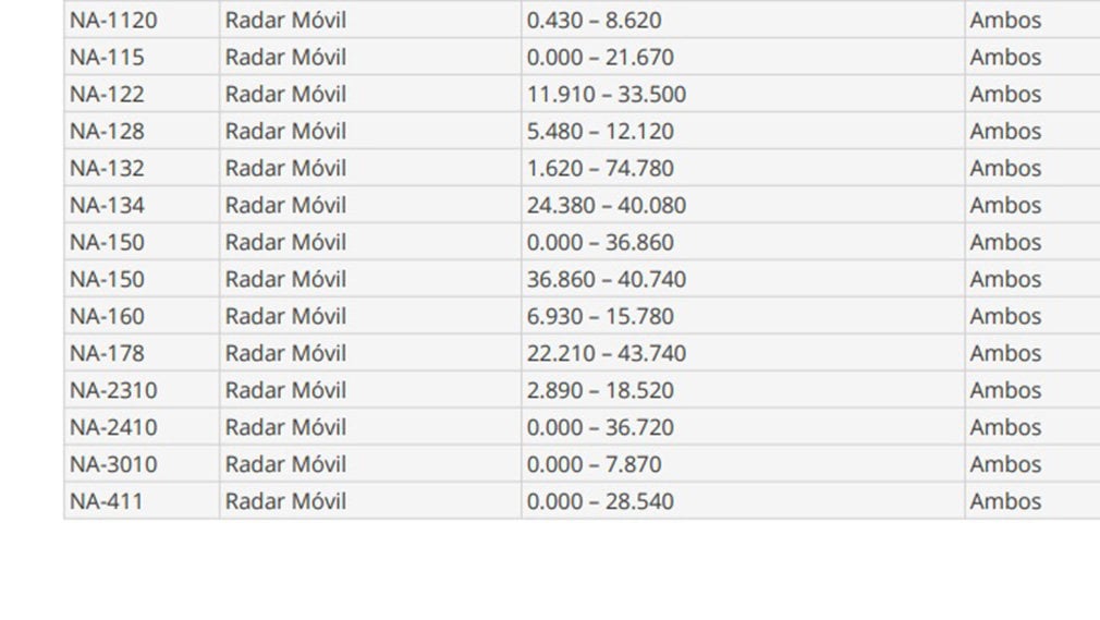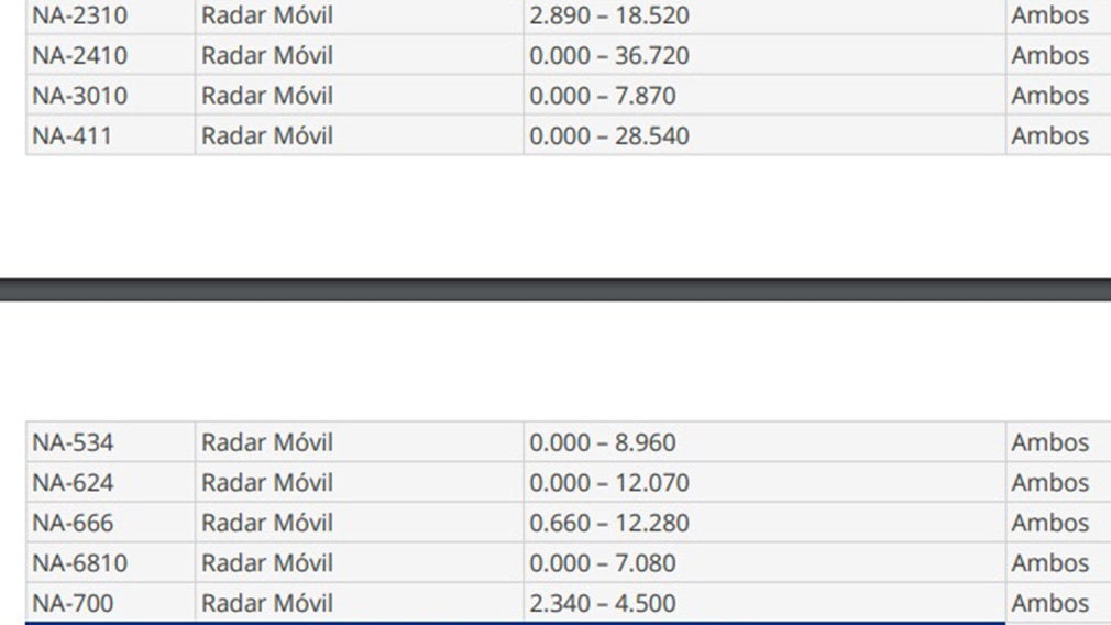 Otros de los radares móviles de Navarra se encuentran entre las siguientes zonas: NA-700 2.340 - 4.5, NA-1110N 0.000 - 3.26, NA-1110 9.970 - 13.39, NA-1110 13.320 - 18.13, NA-1110 20.870 - 28.79, NA-1120 0.000 - 0.43, NA-2310 2.890 - 18.52, NA-2410 0.000 - 36.72, NA-2420 0.000 - 3.17 y en la NA-2420 3.140 - 7.51.