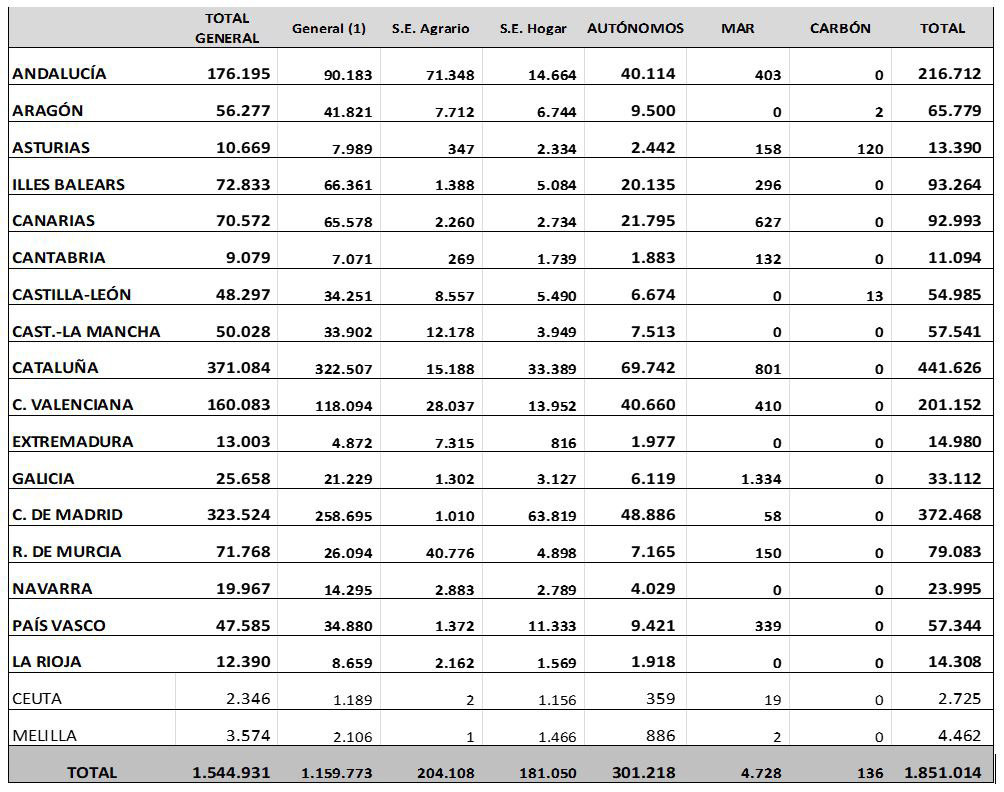Del total de inmigrantes en alta en la Seguridad Social al finalizar octubre, 1.544.931 cotizaban en el Régimen General; 301.218 en Autónomos; 4.728 en el Régimen del Mar, y 136 en el del Carbón. En términos interanuales, la afiliación de extranjeros aumentó el pasado mes de octubre en 117.388 personas (+6,7%).