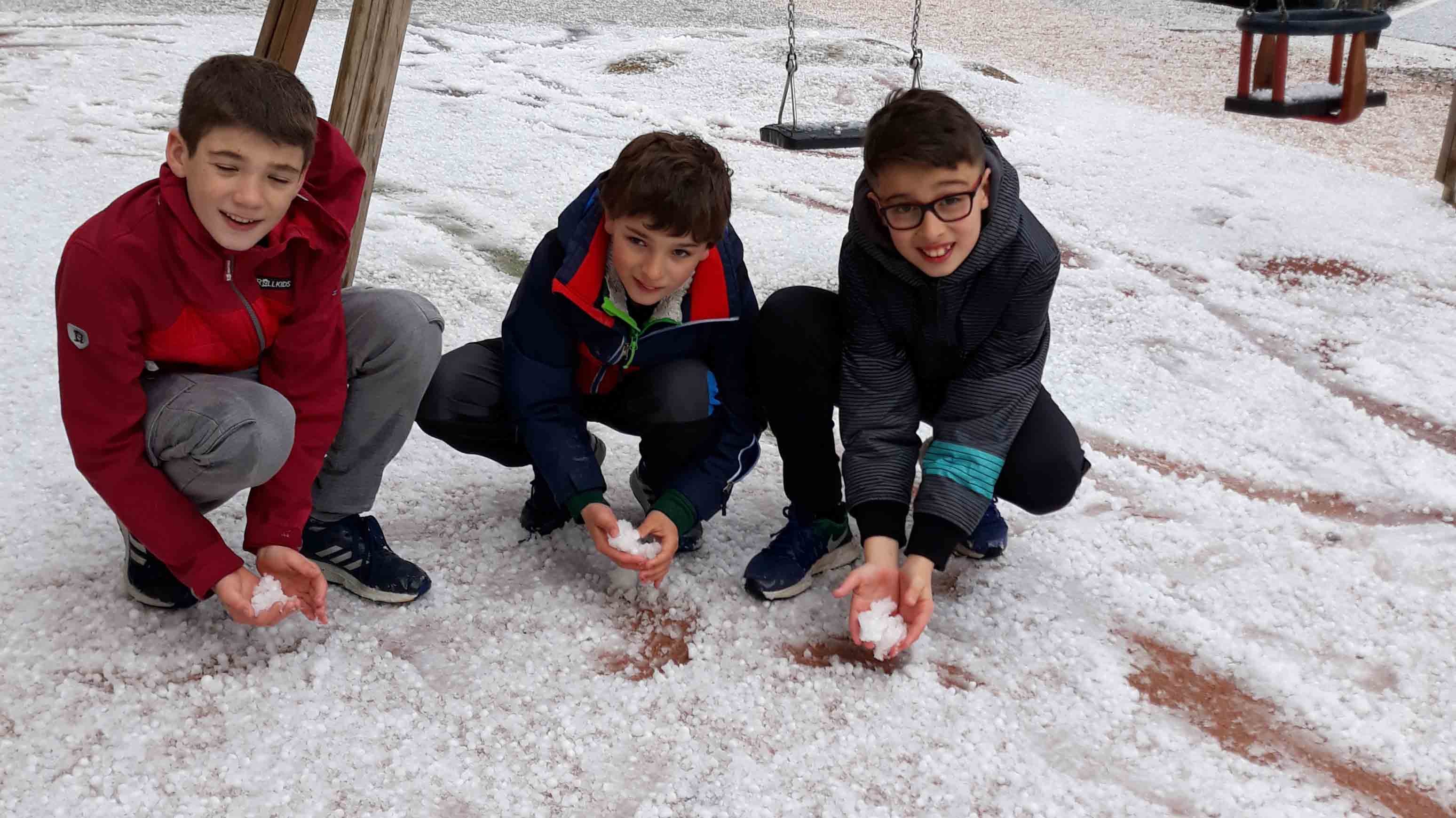 En el caso de Caparroso, algunas de las imágenes han dado a ver que la granizada no ha sido pequeña. La capa de bolas de hielo era gruesa. Incluso en el parque los chavales han dejado de lado los columpios para centrarse en el peculiar fenómeno que ha cambiado el aspecto habitual del pueblo.
