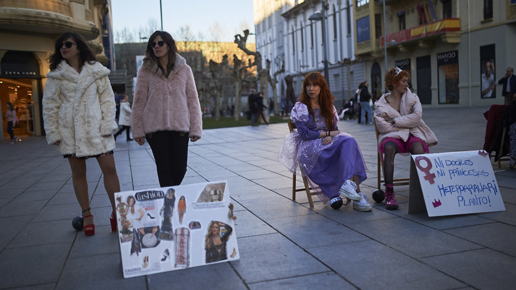 "Ni dóciles, ni princesas", reivindicaban dos feministas sentadas en una silla y vestidas de princesas. Otras dos, posaban con recortes de revistas e iban disfrazas de 'pijas', reivindicando el 'fast fashion' y que las mujeres tengan que estar al servicio de la moda, así como las tallas de la ropa.