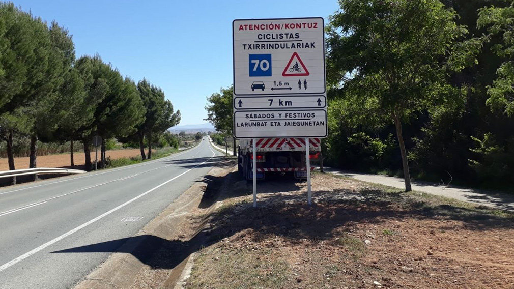 Los paneles y señales, rotulados en castellano y euskera, recuerdan la probable presencia de ciclistas en la carretera, la obligación de respetar la distancia de separación de 1,5 metros respecto a las bicicletas durante las maniobras de adelantamiento, la recomendación de reducción de la velocidad para los vehículos de motor y la longitud del tramo de carretera afectado.