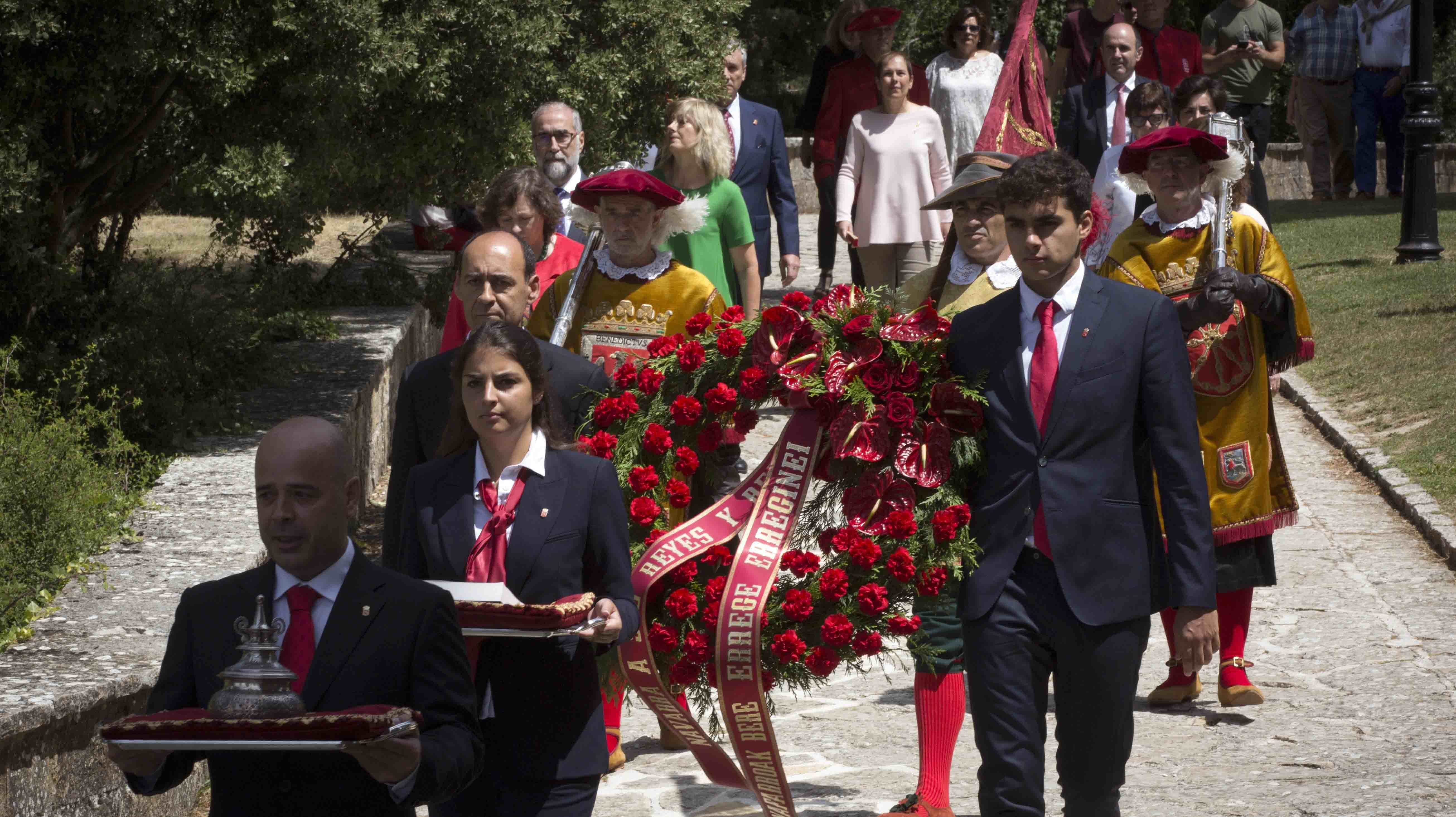 Tras la ceremonia religiosa, ha llegado a la iglesia el cortejo oficial formado por los ujieres que portaban las ofrendas, maceros y rey de armas, y autoridades como la presidenta de Navarra, Uxue Barkos, la presidenta del Parlamento, Ainhoa Aznárez, y los consejeros del Ejecutivo foral.