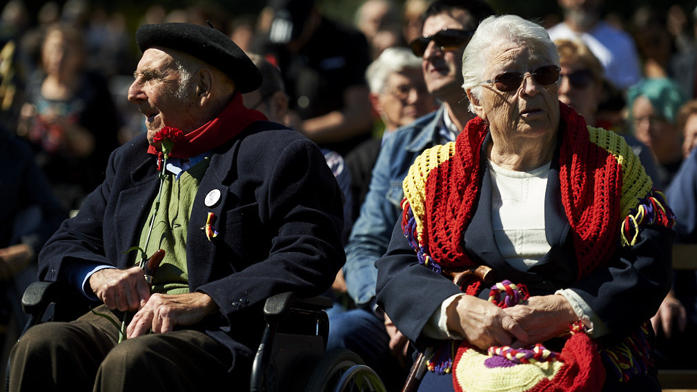Dos de los asistentes al acto celebrado en Pamplona en memoria de los asesinados y represaliados durante la Guerra Civil y el franquismo en Navarra. MIGUEL OSÉS