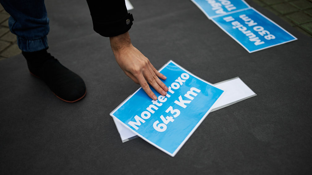 Antes de sus declaraciones, un joven había colocado en el suelo carteles con la distancia en kilómetros a las cárceles donde los etarras condenados por asesinatos, secuestros y extorsión cumplen sus penas.