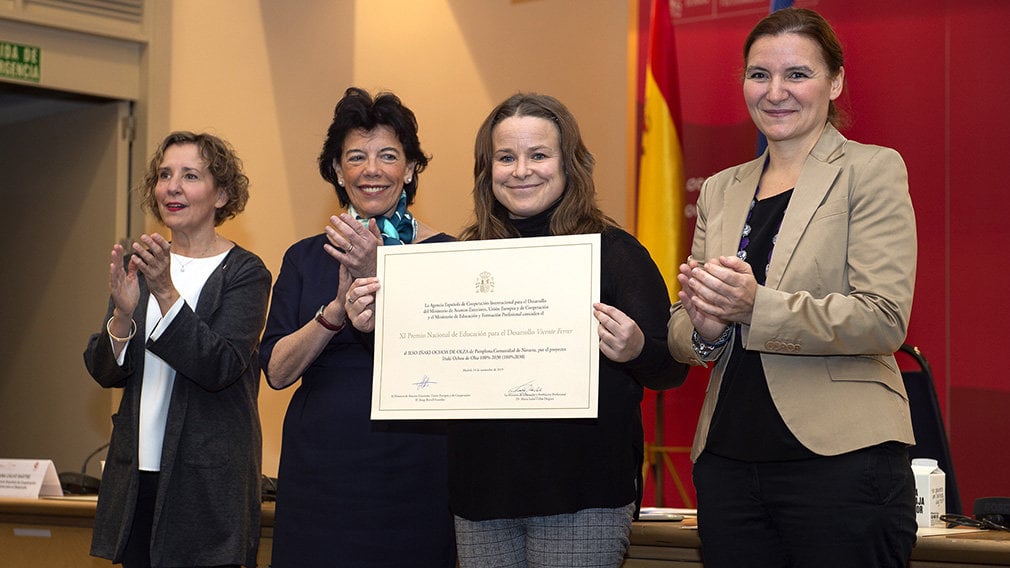 El IESO Iñaki Ochoa de Olza ha recibido el XI Premio Nacional de Educación para el Desarrollo Vicente Ferrer, por su proyecto: IOO% 2030 Educación para el Desarrollo sobre los Objetivos de Desarrollo Sostenible (ODS), llevado a cabo durante el curso 2018/2019, con la implicación de profesorado del centro y coordinado por la ONGD Fundación Paz y Solidaridad.