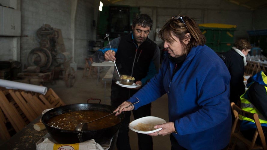 "El origen de este encuentro lo tuvo un párroco de Caparroso llamado don Francisco Valdemoro. Él tuvo la idea, en aquel entonces, de hacer esta comida. Durante las dos Javieradas, un grupo de voluntarios venía a esta nave y todos juntos preparaban calderos para los peregrinos. Ahora lo celebramos solo en la segunda Javierada", explica Mariluz Lapuerta.