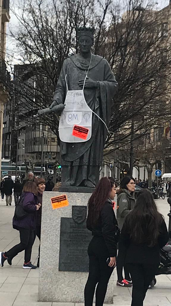 Un grupo de una decena de activistas feministas ha decidido colgar delantales en varios lugares emblemáticos de la capital navarra, siguiendo el ejemplo del Parlamento de Navarra y su colocación de un mandil en su fachada.