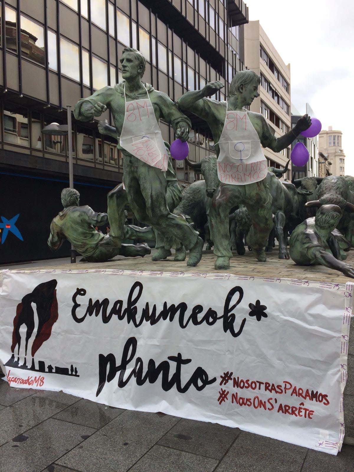 Además, han decidido colgar los delantales reivindicativos en otros símbolos de Pamplona, como la escultura del Nobel de Literatura Ernest Hemingway, situada junto a la Plaza de Toros.