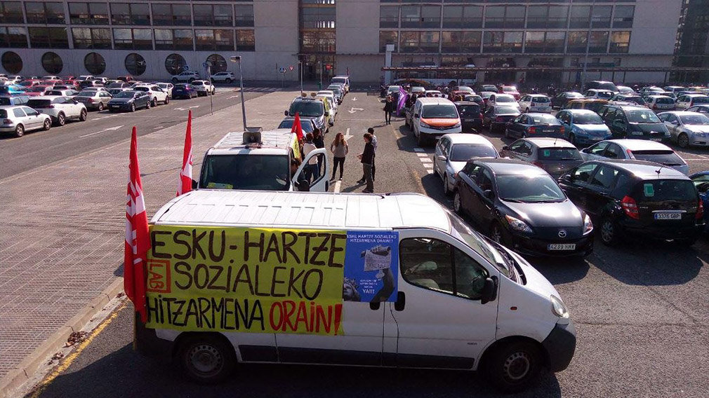 Una caravana de vehículos en los que viajaba trabajadores de Intervención Social de la Comunidad foral ha partido esta mañana de miércoles de Berriozar y ha andado por Buztintxuri, Rochapea, San Juan, Iturrama, Segundo Ensanche y Arrosadía.