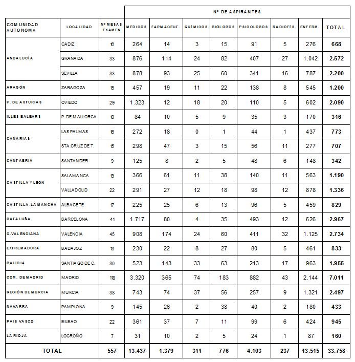 -Enfermeros (EIR): 994 plazas para las que están admitidos 13.515 aspirantes, de los cuales el 86% son mujeres y el 14% hombres. En la Comunidad Foral de Navarra, el número de personas que acuden al examen es de 180 candidatos.