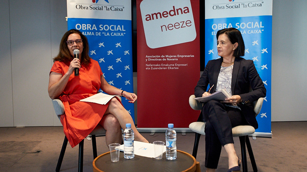 En la presentación han participado la directora territorial de CaixaBank en Navarra, Ana Díez Fontana, y la presidenta de AMEDNA Cristina Sotro Belzarena.