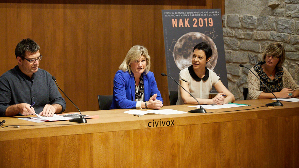 NAK 2019, reforzando los objetivos planteados desde sus inicios, ofrecerá diez estrenos absolutos (cinco musicales y cinco videocreaciones) y más de veinticinco estrenos en Navarra de obras de compositores de Navarra, País Vasco, Cataluña, Madrid, Aragón, y de países como Francia, Argentina, EEUU, Alemania, Rusia y Hungría. En esta nueva edición interactuarán cerca de cien artistas entre músicos, videocreadores y divulgadores científicos.![]()