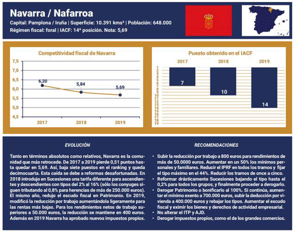 En cuanto a la Comunidad foral, la UCI observa que "Navarra es, un año más, una de las grandes perdedoras en el Índice Autonómico de Competitividad Fiscal. A pesar de haber aumentado ligeramente la deducción por trabajo para las rentas más bajas, sigue manteniendo la última posición en el subíndice del Impuesto sobre la Renta. Además, al crear nuevos impuestos propios, como el impuesto a la eliminación en vertedero y a la incineración de residuos, y al recuperar el impuesto sobre grandes establecimientos comerciales, baja tres puestos en el subíndice correspondiente. Todo esto hace que Navarra baje cuatro puestos en el ranking global, hasta la decimocuarta posición".
