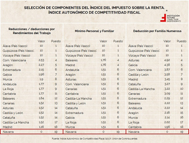 Navarra se sitúa como la comunidad autónoma con peor competitividad en cuanto al Impuesto sobre la Renta de las Personas Físicas (IRPF), a tenor de los datos recogidos en el Índice Autonómico de Competitividad Fiscal, elaborado por la Unión de Contribuyentes y que sirve de guía para que cada región pueda mejorar su sistema tributario haciéndolo más competitivo y atractivo para empresarios y residentes