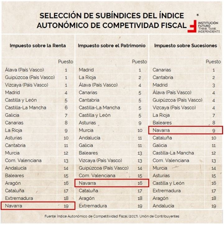 De los seis impuestos que componen el índice, Navarra ocupa la última posición en el Impuesto sobre la Renta, el puesto 16 en el Impuesto de Patrimonio y el noveno en el de Sucesiones. La intención del Gobierno de Navarra de aumentar la tributación de las herencias, la posición de la Comunidad Foral en el impuesto de sucesiones empeorará previsiblemente en breve.