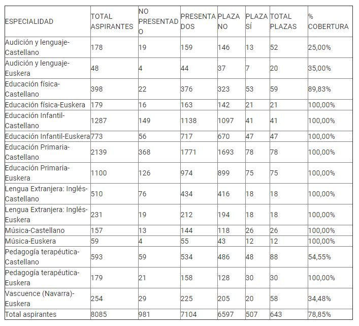 Finalmente, salvo en dos especialidades en las que no se ha superado el 50% de cobertura de las plazas convocadas, en prácticamente todas se ha alcanzado el 100% de la cobertura y en muchas se ha generado lista de personas aprobadas sin plaza. En total se ha cubierto casi el 80% de las plazas previstas en la convocatoria. Los datos exactos se pueden consultar en la siguiente tabla: