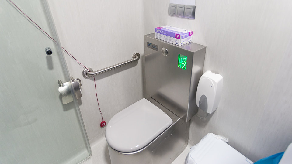 El sistema de evacuación instalado consta de inodoros de acero inoxidable que separan orina y heces y permiten la recuperación de los residuos radiactivos generados de manera automática, sin necesidad de manipulación. ![]()