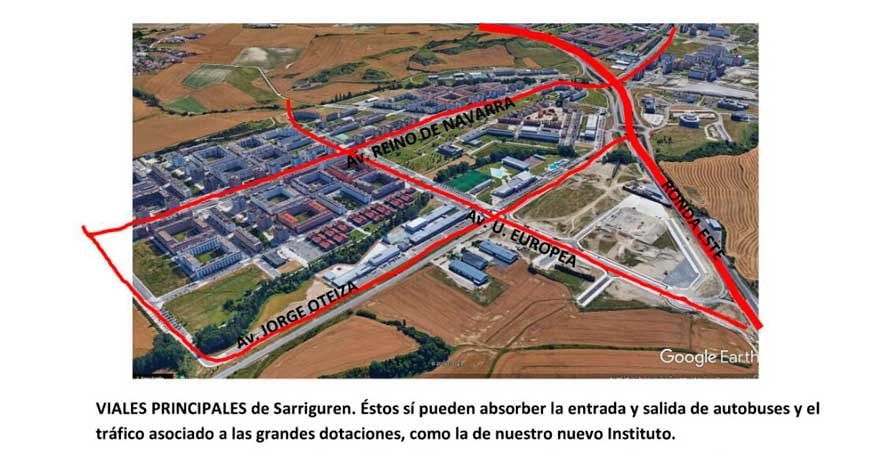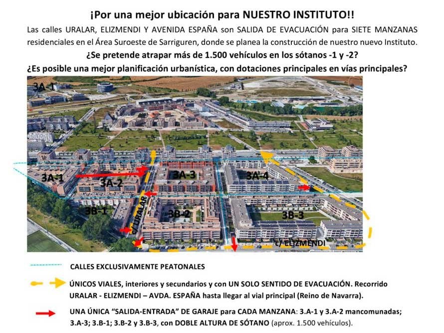 Piden “informes exhaustivos que evalúen las posibles repercusiones sobre el tráfico ya que las calles Uralar y Elizmendi, ubicadas junto a la parcela donde se levantaría el instituto, son sólo de un solo carril y único sentido de circulación y funcionan como únicas vías de evacuación para siete manzanas residenciales de la zona suroeste de Sarriguren, con una flota estimada de 1.500 vehículos. Denuncian que la situación podría desembocar en más atascos de tráfico.