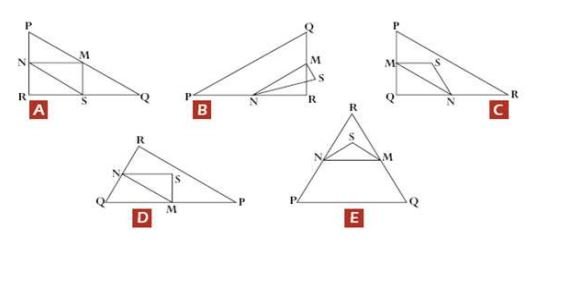 El triángulo PQR es un triángulo rectángulo con el ángulo recto en R. El lado RQ es menor que el lado PR. M es el punto medio del lado PQ y N es el punto medio del lado QR. S es un punto del interior del triángulo. El segmento MN es mayor que el segmento MS.