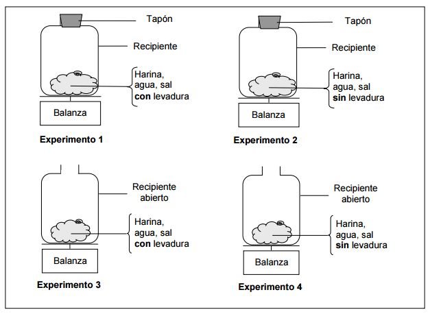 Pregunta 8: Algunas horas después de haber hecho la mezcla, el cocinero la pesa y observa que su masa ha disminuido. La masa de la mezcla es la misma al comienzo de cada uno de los cuatro experimentos que se muestran abajo. ¿Qué dos experimentos debería comparar el cocinero para determinar si la levadura es la responsable de la pérdida de masa