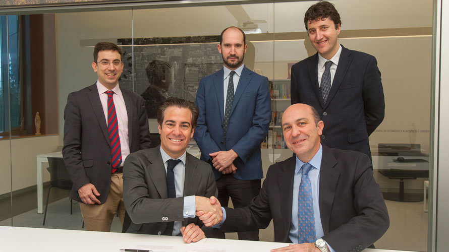 En la firma del acuerdo han participado el decano el Facultad, Ignacio Ferrero, el presidente del ICO, Pablo Zalba, así como los investigadores Germán López Espinosa y Antonio Moreno Ibáñez.