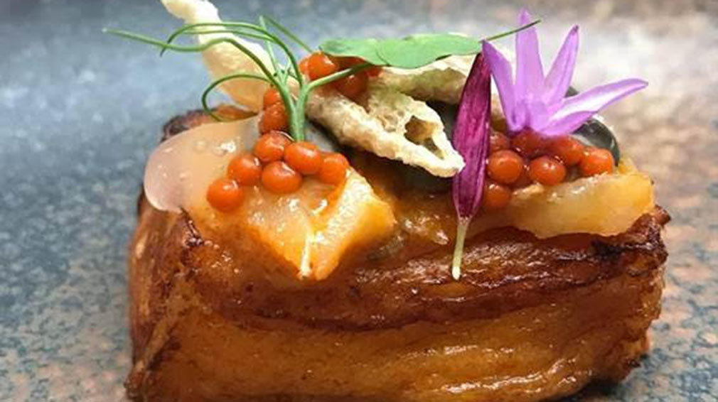 El pincho consta de una torrija de brioche rellena de bacalao ajoarriero con ali oli de ajo negro, gel de txacoli, caviar de pimentón y cortezas de bacalao.