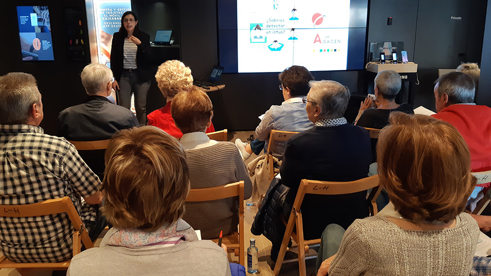 La oficina Store Abejeras de CaixaBank, una de las 10 oficinas Store que la entidad tiene en la ciudad de Pamplona, ha acogido hoy la charla “¿Sabrías detectar un ictus?” impartida por Usua Purroy, trabajadora social de Adacen.