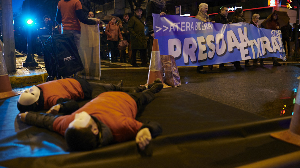 En ese lugar se ha realizado una performance, en la que dos personas con máscaras estaban tiradas en el suelo, simbolizando a las personas fallecidas en accidentes de tráfico en los desplazamientos para visitar a un familiar preso.