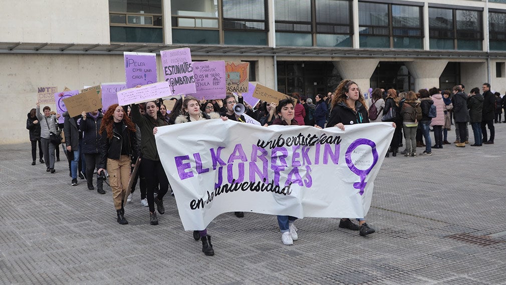Por su parte, la Universidad Pública de Navarra (UPNA) se adherido este viernes a la conmemoración del Día Internacional de las Mujeres. Por ello, además de las distintas actividades relacionadas con el feminismo celebradas esta semana, cerca de 150 integrantes de la comunidad universitaria (PDI, PAS y estudiantes) han participado en una acción reivindicativa en la Universidad consistente en una lectura de poemas y una kalejira con carteles reivindicativos.