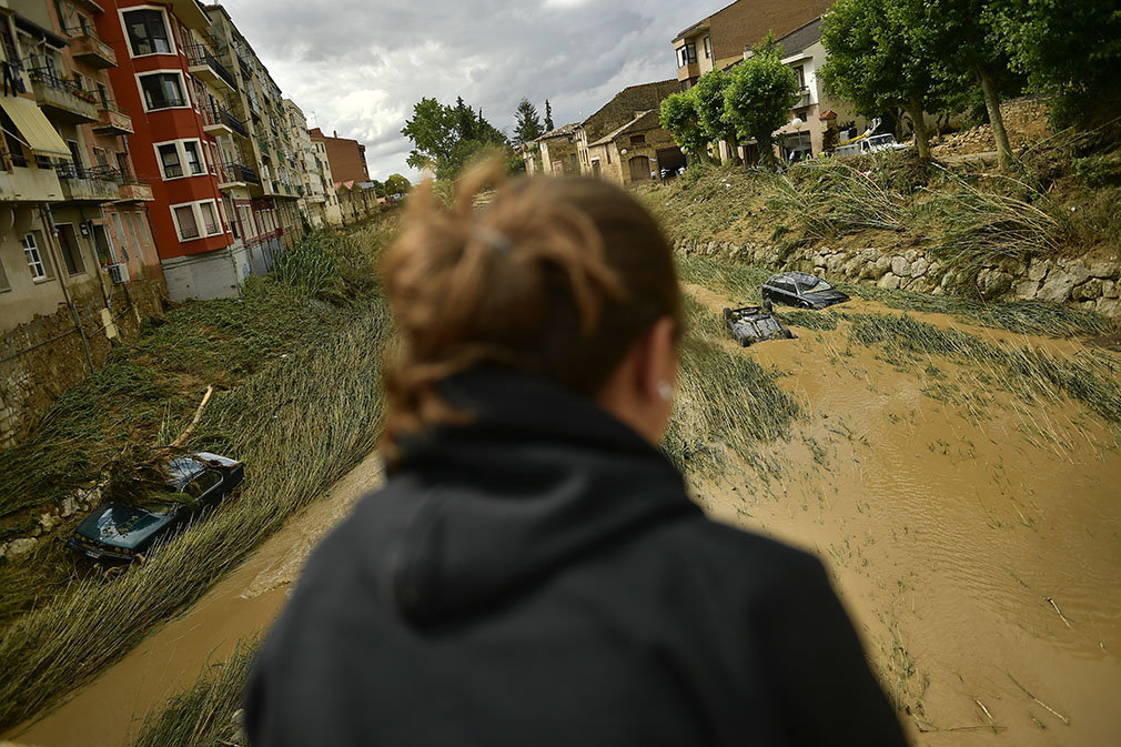 Por otro lado, la fotografía de Tafalla es de Álvaro Barrientos (AP), donde se ve a una mujer observando el resultado de la riada que se ha llevado por delante varios coches.