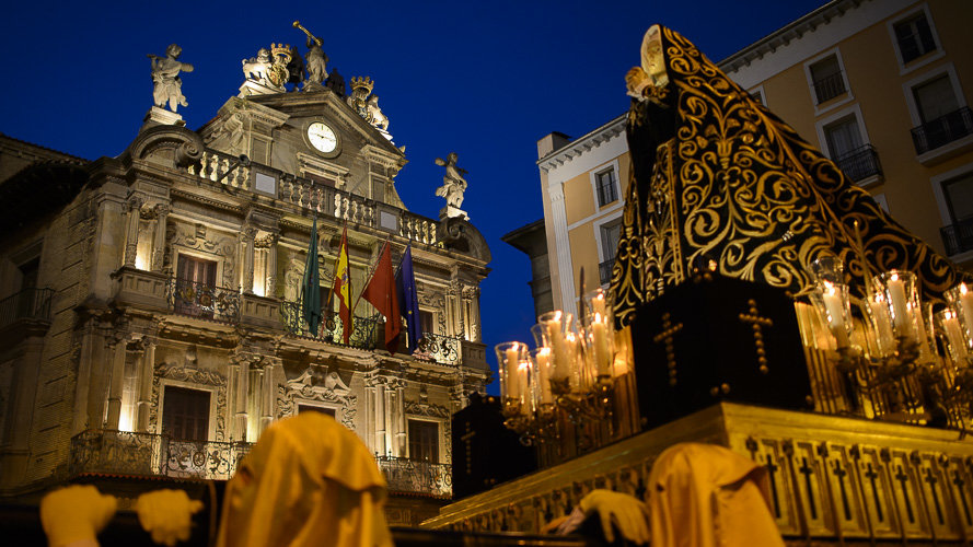 Ya en Viernes Santo, la capital navarra celebrará su procesión del Santo Entierro, la más multitudinaria, que partirá de la Hermandad de la Pasión del Señor para recorrer las calles Dormitalería, Javier, Compañía, Curia, Catedral, Navarrería, Mercaderes, Plaza Consistorial, San Saturnino, Mayor, Rincón de la Aduana, Paseo Dr. Arazuri, San Antón, Zapatería, Calceteros, Mercaderes, Calderería, Bajada de Javier y Dormitalería, hasta el lugar de comienzo. Comenzará a las 19:30 horas.