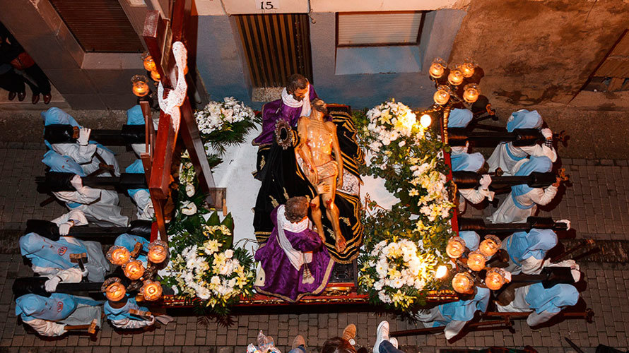 Esa misma tarde (20 horas), tiene lugar su procesión, en la que se pueden contemplar pasos barrocos del siglo XVII, entre los que destaca la Entrada a Jerusalén. El momento más importante es el encuentro de Cristo con Cirineo y la Verónica en la plaza del Crucero. Allí, un hombre vestido de morado se arrodilla, besa el suelo tres veces y se acerca a Cristo para ayudarle a portar la cruz.