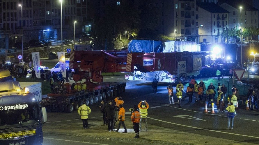 Desde el mismo puerto de Pasaia partirá hacia Sangüesa esta misma madrugada. El transporte sólo viajará de noche y en su primera etapa apenas recorrerá 12 kilómetros. Trae consigo una pieza de aerogenerador que llega desde Japón y 'aparcará' en las instalaciones del laboratorio CENER en Sangüesa.
