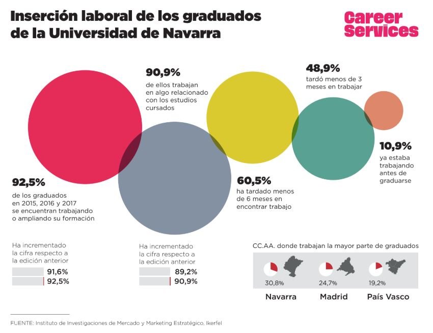 Por otra parte, el 22,5% de los graduados encontró un trabajo por medio de Career Services (el departamento de salidas profesionales de la Universidad de Navarra), y el 47,5% de los usuarios del portal de empleo del centro académico aseguró que esta plataforma resulta útil para acceder a prácticas y conseguir empleo, "confirmando así el compromiso reforzado que la Universidad tiene con la transferencia de talento a la sociedad".