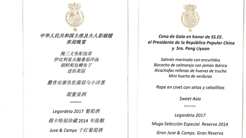 El menú de la Cena de Gala que SS.MM Los Reyes de España ofrecieron en el Palacio Real al presidente de China, Xi Jinping, y su esposa, Peng Liyuan, muestra como el Chivite Legardeta Chardonnay 2017 fue el seleccionado como vino blanco para acompañar uno de los momentos más importantes de la visita de Estado de tres días a España de Jinping.