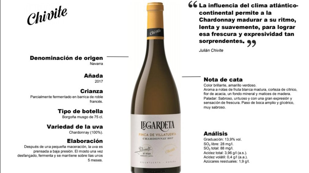 Chivite Legardeta Chardonnay ha nacido en la Finca de Legardeta, en la subzona de Tierra Estella y es en este territorio donde la variedad Chardonnay ha encontrado un reducto único, con unas condiciones climáticas y de suelos perfectos para obtener tipicidad, complejidad y capacidad de envejecimiento.