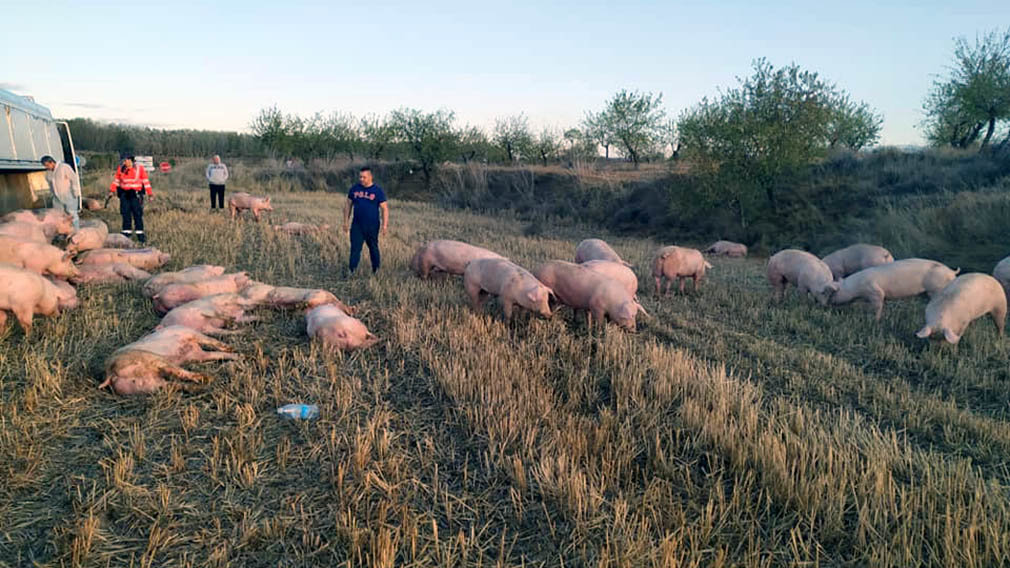 Decenas de cerdos muertos al salirse de la vía el camión que los transportaba en Cintruénigo