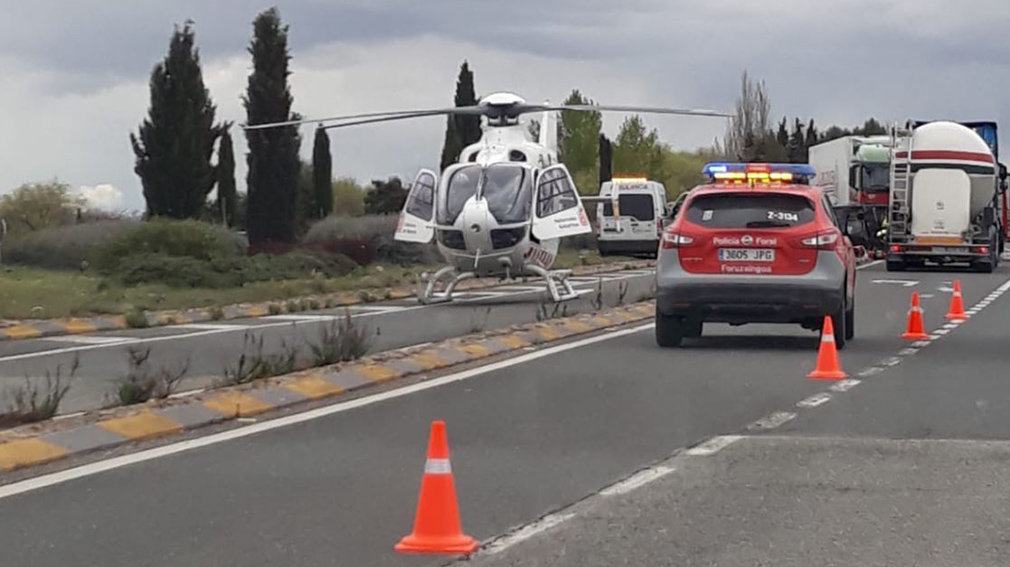 El suceso ha ocurrido a las 14.42 horas y hasta el lugar del siniestro se han desplazado agentes de Seguridad Ciudadana de la Policía Foral, que han alertado de fuertes retenciones, patrullas de Seguridad Vial y Atestados, así como bomberos, servicios de asistencias de la zona y un helicóptero de emergencias.