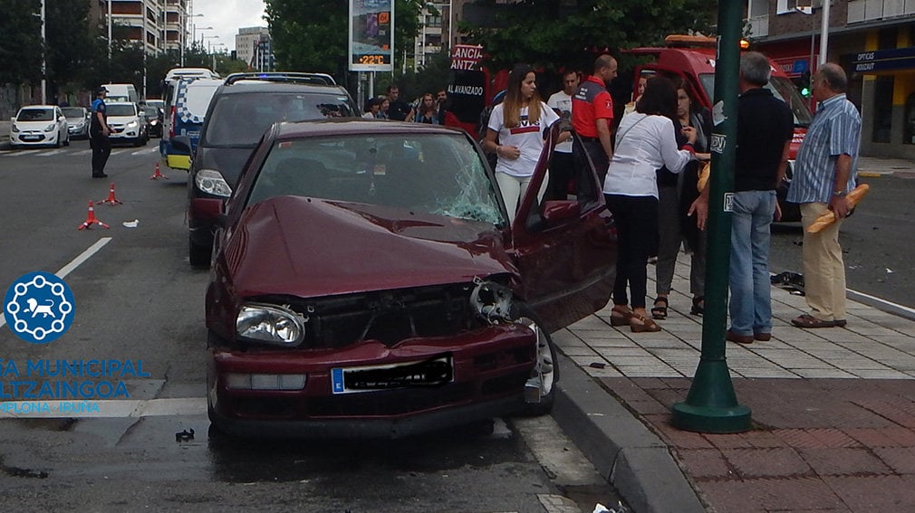 Dos agentes de la Policía Foral y una mujer han resultado heridos en una aparatosa colisión de tráfico que ha tenido lugar este pasado lunes en una céntrica avenida de Pamplona.